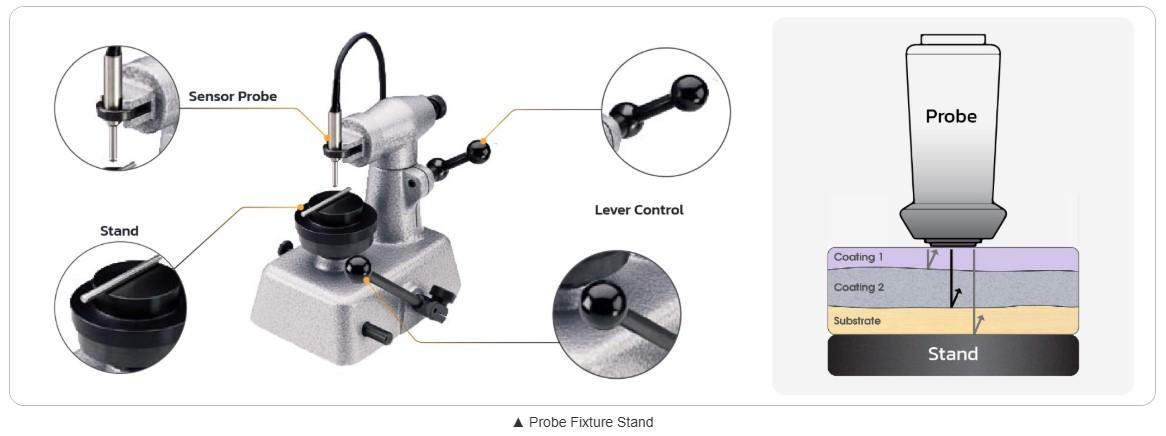 อุปกรณ์ยึดจับโพรบและชิ้นงาน ถูกออกแบบขึ้นเพื่อช่วยให้การตรวจวัดเป็นไปอย่างมีประสิทธิภาพ ค่าที่ได้มีความถูกต้องและแม่นยำสูง จึงทำให้ผู้ใช้งานมั่นใจได้ว่าส่วนของเซนเซอร์ที่ใช้ตรวจวัดนั้นสัมผัสกับพื้นผิวของชิ้นงานในแนวราบ (0°) ทั้งยังสามารถควบคุมและทำซ้ำได้ โดยที่ยังให้ความเสถียรในการตรวจวัดด้วยเช่นกัน