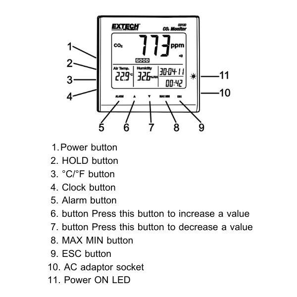 EX-CO100 เครื่องวัดก๊าซคาร์บอนไดออกไซด์ เหมาะสำหรับ วัดอุณหภูมิอากาศ และความชื้น พร้อมการเตือนภัยที่สามารถปรับแต่งได้ทั้งแบบมองเห็นและได้ยิน แสดงคุณภาพอากาศในร่มเป็น ppm พร้อมการแสดงสถานะ 0 ถึง 800 ppm (ปกติ) หากค่าวัดได้ 800 ถึง 1200ppm (จะไม่ปกติ)