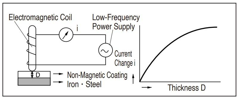 เมื่อขดลวดแม่เหล็กไฟฟ้ากระแสสลับ (AC Electromagnet) ถูกนำเข้าไปใกล้กับเหล็กหรือโลหะแม่เหล็ก ระดับของเส้นแรงแม่เหล็กที่ไหลผ่านขดลวดจะเปลี่ยนแปลง ทำให้แรงดันไฟฟ้าที่ปลายขดลวดเปลี่ยนไปด้วย การเปลี่ยนแปลงของแรงดันนี้จะถูกตรวจวัดผ่านค่ากระแสไฟฟ้า และนำไปคำนวณเพื่อแปลงเป็นค่าความหนาของผิวเคลือบ