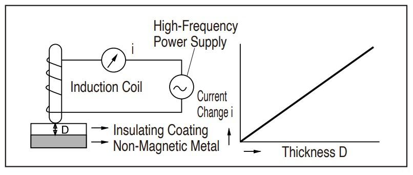 เมื่อขดลวดที่มีกระแสไฟฟ้าความถี่สูงไหลอย่างสม่ำเสมอถูกนำเข้าใกล้กับผิวโลหะ จะเกิดกระแสไหลวน (Eddy Currents) บนผิวโลหะนั้น กระแสไหลวนเหล่านี้จะเปลี่ยนแปลงตามระยะห่างระหว่างขดลวดกับผิวโลหะ ทำให้แรงดันไฟฟ้าที่ปลายขดลวดเปลี่ยนไปด้วย การเปลี่ยนแปลงของแรงดันนี้จะถูกตรวจวัดผ่านค่ากระแสไฟฟ้าและนำไปคำนวณเพื่อแปลงเป็นค่าความหนาของผิวเคลือบ