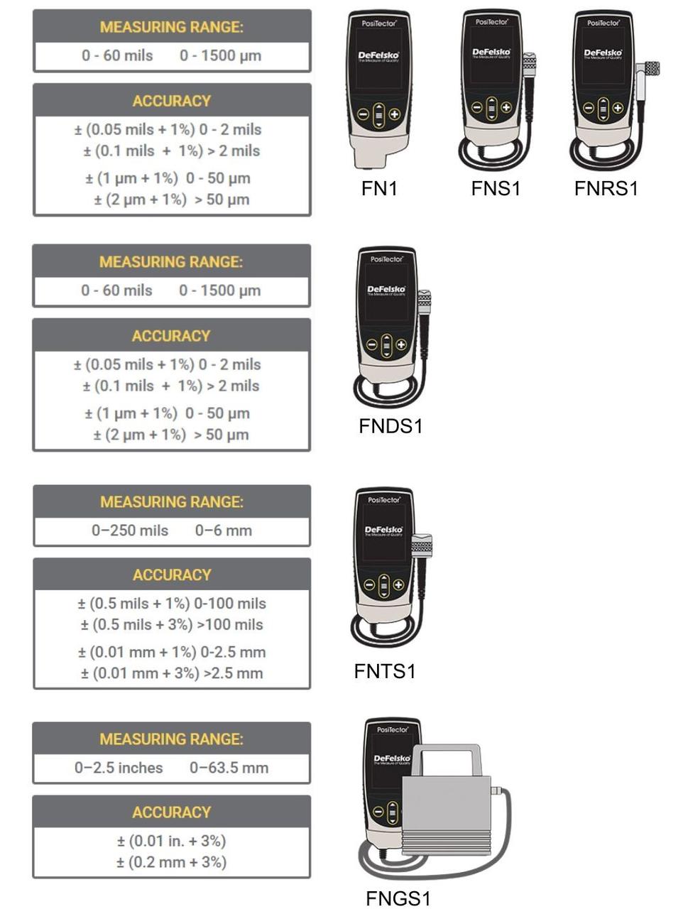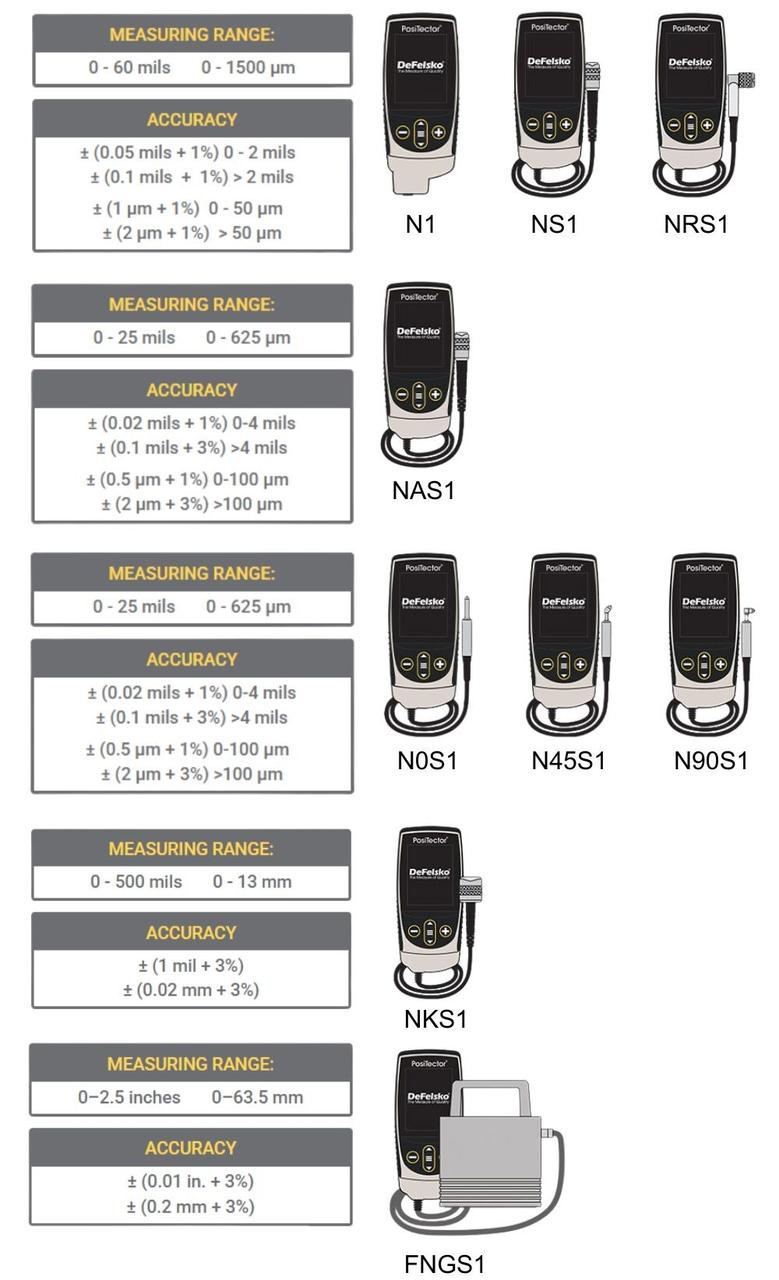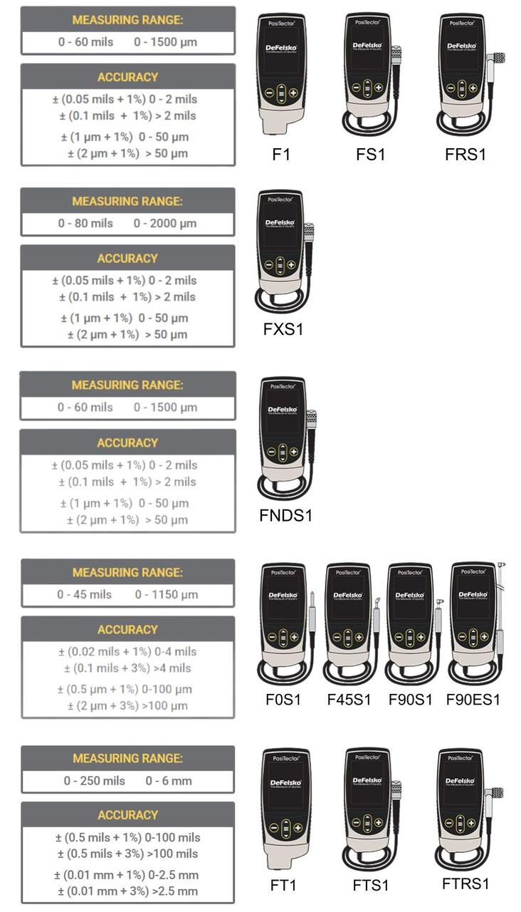 รหัสที่ลงท้ายด้วยเลข 1 หมายถึง Standard Gage Body พร้อมหัวโพรบ Ferrous หรือ Non-Ferrous เช่น F1, N1