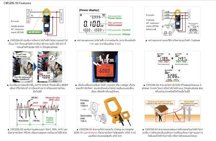 HIOKI CM3286-50 เป็น AC Clamp Power Meter ระดับมืออาชีพที่ออกแบบมาเพื่อตอบโจทย์งานตรวจสอบและวิเคราะห์ระบบไฟฟ้าในภาคอุตสาหกรรม อาคารพาณิชย์ และระบบจำหน่ายไฟฟ้า ด้วยช่วงการวัดที่กว้าง ตั้งแต่กระแสไฟฟ้าระดับต่ำเพียง 60 mA ซึ่งเทียบเท่ากำลังไฟฟ้า 5 W ไปจนถึงกระแสสูงสุด 600 A หรือกำลังไฟฟ้าสูงถึง 360 kW สำหรับระบบเฟสเดียว ทำให้สามารถใช้งานได้ตั้งแต่งานโหลดขนาดเล็กไปจนถึงงานระบบไฟฟ้ากำลังสูงในโรงงานผลิต