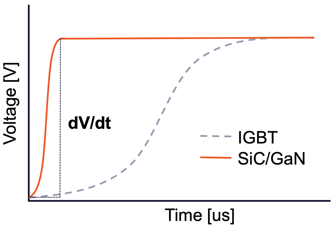 อย่างไรก็ตาม การสวิตช์ที่รวดเร็วขึ้นนี้ทำให้เกิดการเปลี่ยนแปลงของแรงดันไฟฟ้าอย่างรวดเร็ว (dV/dt สูง) ซึ่งอาจทำให้เกิดแรงดันกระชากและเพิ่มความเครียดทางไฟฟ้าต่อวัสดุฉนวน