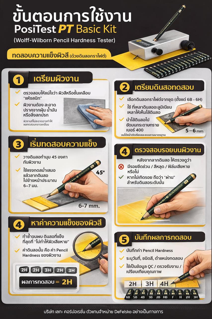 DeFelsko PosiTest PT Basic Kit คือดินสอหลายระดับความแข็ง สำหรับประเมินความทนต่อรอยขีดข่วนของสีและสารเคลือบ เพื่อดูว่าผิวสีแข็งและทนรอยแค่ไหน ช่วยให้รู้ว่างานพ่นสีหรือเคลือบผิวมีคุณภาพตามที่ต้องการหรือไม่ ตามมาตรฐานสากล ISO 15184 และ ASTM D3363