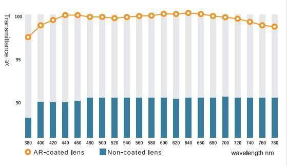 แสงที่ส่งผ่านอยู่ที่ประมาณ 90% ในช่วงแสงที่ตามองเห็น ส่วนที่เหลือประมาณ 10% จะสะท้อนที่ผิวเลนส์ การสะท้อนนี้ทำให้เกิดแสงจ้าและความไม่สบายตา