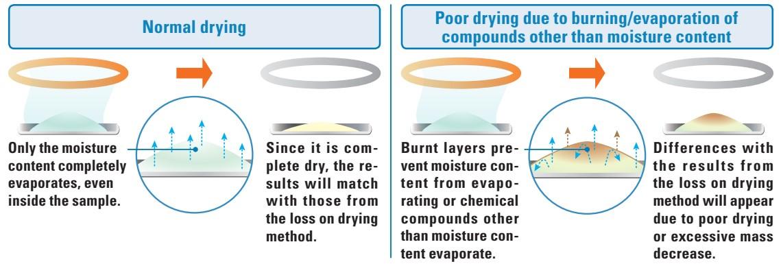 ผลการวัดจากเครื่องวิเคราะห์ความชื้นอาจแตกต่างกันไปตามเงื่อนไขการอบแห้งที่ตั้งไว้ ตัวอย่างเช่น หากเกิดการไหม้บนผิวหน้าของตัวอย่าง อาจทำให้ความชื้นภายในระเหยออกได้ไม่สมบูรณ์ หรือเกิดการระเหยของสารอื่นที่ไม่ใช่ความชื้น ส่งผลให้ค่าที่วัดได้ไม่สอดคล้องกับผลจากวิธี Loss on Drying ดังนั้น การกำหนดเงื่อนไขการอบแห้งที่เหมาะสมจึงมีความสำคัญต่อความแม่นยำของผลการวัด
