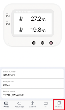 เมื่อมีการตรวจพบการเตือนขณะอยู่ที่หน้าหลักของแอป T&D Thermo จะมีคำว่า [Warning] แสดงอยู่ในรายการอุปกรณ์นั้น