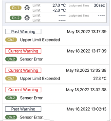 Warning Judgment Time | 30 วินาที ถึง 60 นาที (เลือกได้ 9 ระดับ)ระบบจะแจ้งเตือนเมื่อค่าที่วัดเกินค่าที่ตั้งไว้ หรือเกิดข้อผิดพลาดของเซนเซอร์ต่อเนื่องเกินเวลาที่กำหนด | 0 วินาที (เท่ากับช่วงเวลาบันทึกข้อมูล) หากค่าที่บันทึกเกินค่าที่ตั้งไว้ หรือเกิดข้อผิดพลาดของเซนเซอร์ ระบบจะแจ้งเตือนทันที |