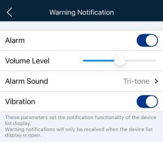 สามารถตั้งค่าให้โทรศัพท์มือถือส่งเสียงเตือนหรือสั่นเมื่อได้รับการแจ้งเตือนแบบ Warning ได้ โดยไปที่เมนู (☰) (มุมซ้ายบนของหน้าหลัก) > [App Settings] > [Warning Notification]