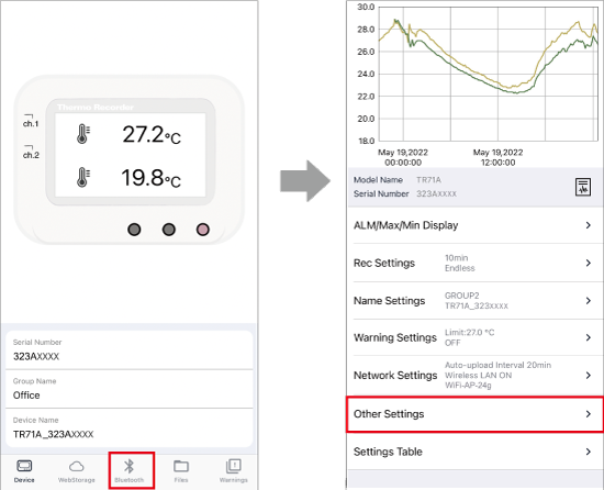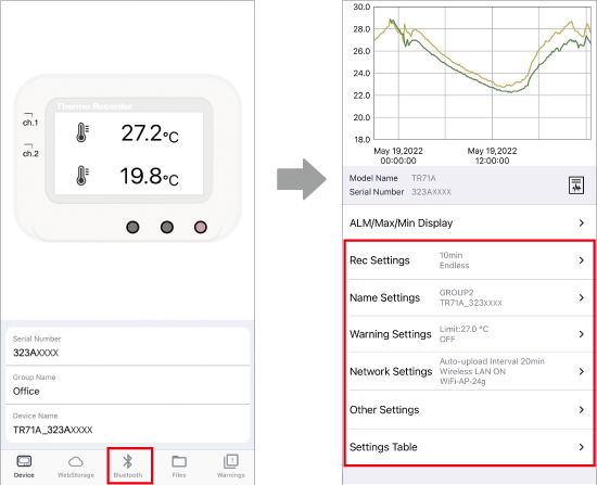 เปิดแอป T&D Thermo และเลือกอุปกรณ์ที่เชื่อมต่อไว้ จากนั้นเลือกเมนู “Bluetooth” หากต้องการตั้งค่าผ่านระบบคลาวด์ ให้ไปที่เมนู "WebStorage"