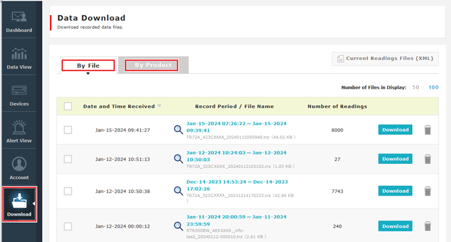 ไฟล์ข้อมูลที่ส่งแบบ Manual ผ่านแอป T&D Thermo สามารถเข้าถึงได้จากเมนู [Download] เพื่อใช้ดูกราฟข้อมูล และดาวน์โหลดไฟล์ไปยังคอมพิวเตอร์ (สามารถดูรายละเอียดเพิ่มเติมได้ที่นี่ [Click])