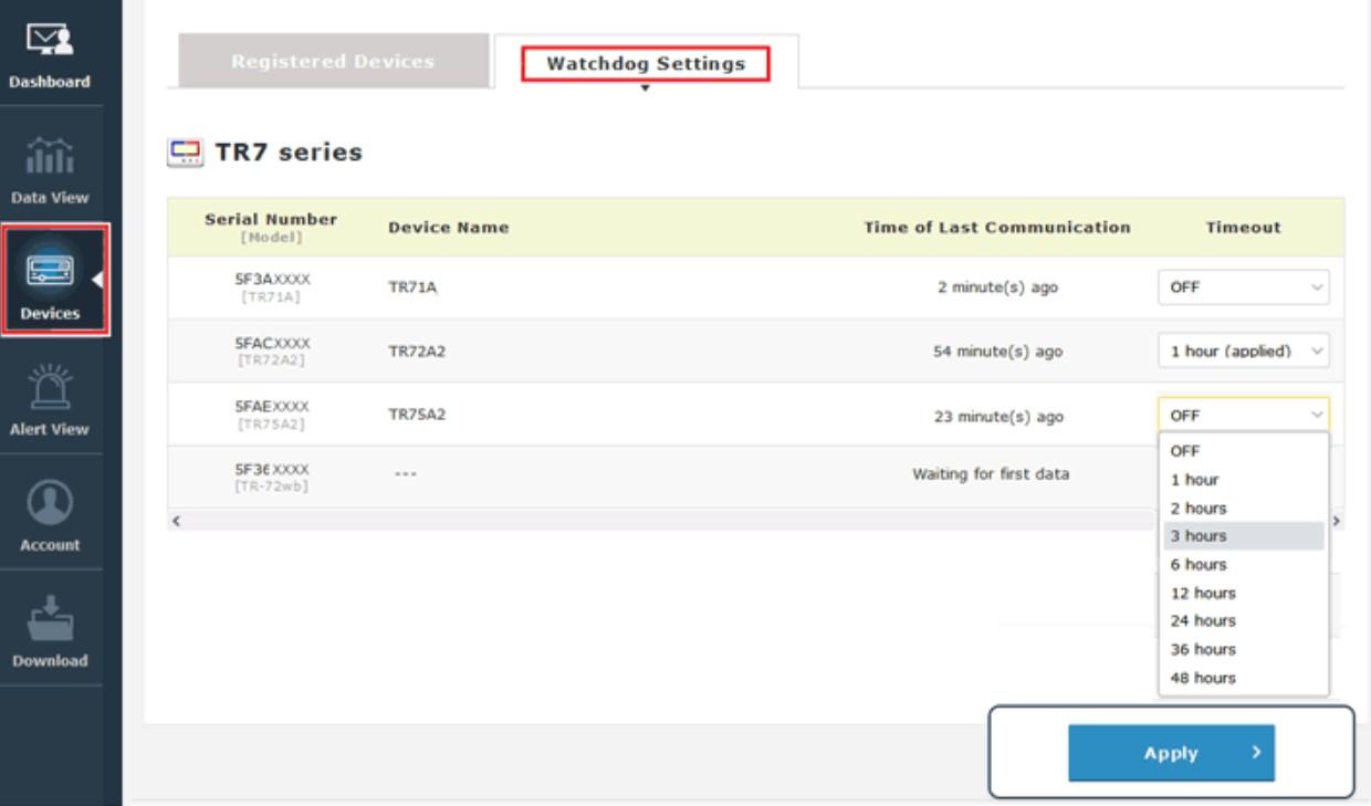 เปิดเมนู [Devices] เพื่อตรวจสอบและเปลี่ยนแปลงการตั้งค่าอุปกรณ์ โดยเลือกแท็บ Registered Devices หรือ Watchdog Settings เพื่อแสดงเนื้อหาการตั้งค่าที่เกี่ยวข้อง
