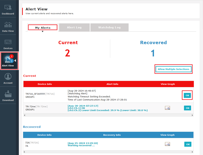 [Allow Multiple Selections] Button | สามารถเลือกการแจ้งเตือนได้หลายรายการหรือเลือกทั้งหมดที่ยังไม่ได้ยืนยันพร้อมกัน เมื่อทำเครื่องหมายเลือกการแจ้งเตือนที่ต้องการ แล้วคลิกปุ่ม [OK] การแจ้งเตือนเหล่านี้จะถูกลบออกจากหน้าจอ [My Alerts] |