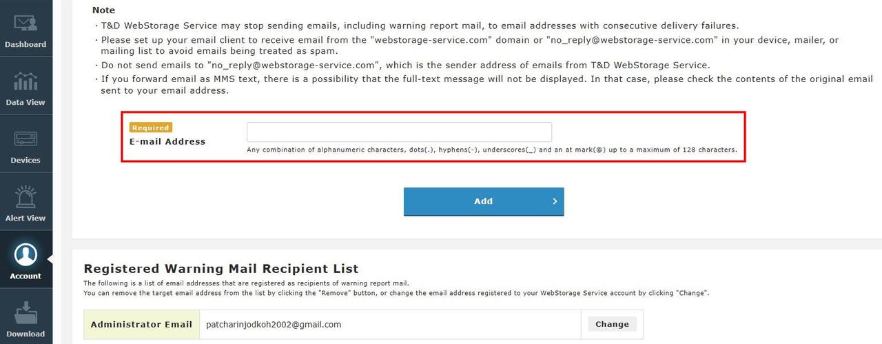ผู้ใช้งานสามารถเปลี่ยนการตั้งค่าการแจ้งเตือนได้จากเมนู [Devices] และสามารถเพิ่มที่อยู่อีเมลสำหรับรับการแจ้งเตือนได้สูงสุด 3 ที่อยู่ (ไม่รวมอีเมลที่ใช้ลงทะเบียนบัญชีผู้ใช้) หากต้องการเพิ่มที่อยู่อีเมลผู้รับการแจ้งเตือน: