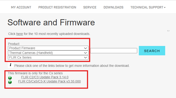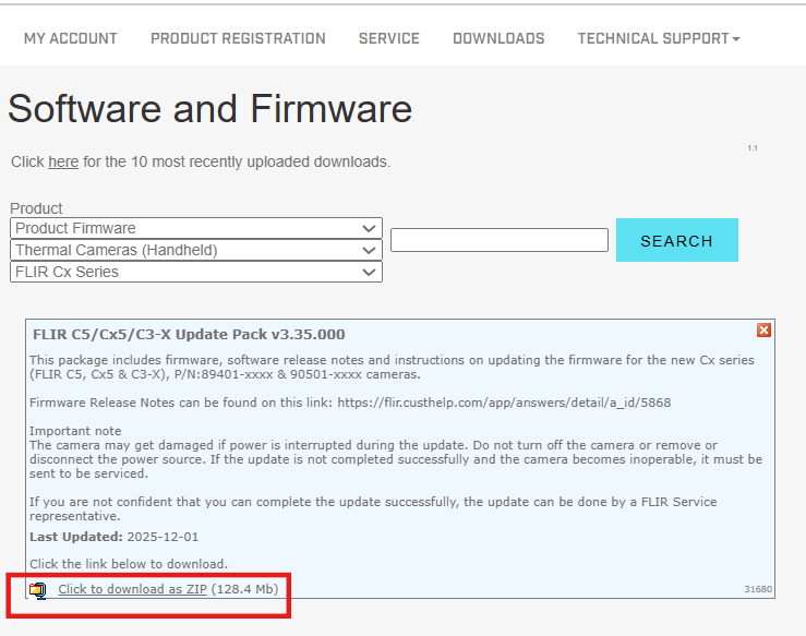 ให้เลือกรายละเอียดตามรูปต่อไปนี้ เมื่อเลือกเรียบร้อยแล้วจะพบลิงค์ Download ด้านล่าง ให้คลิ๊กที่ FLIR C5/Cx5/C3-X Update Pack V3.35.000