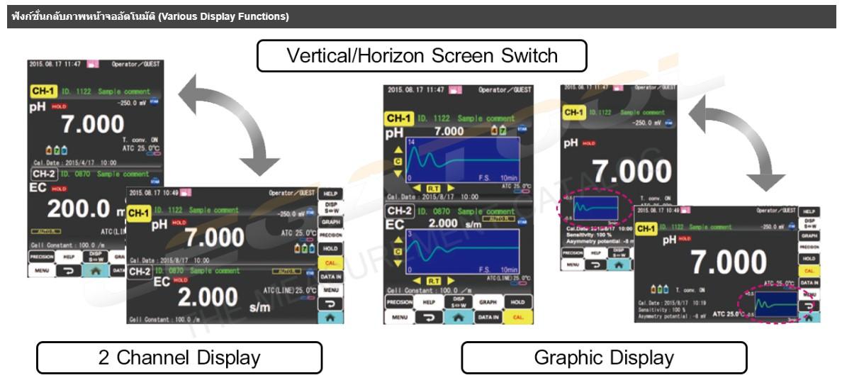 เครื่องวัดคุณภาพน้ำอเนกประสงค์แบบตั้งโต๊ะ สามารถวัดผลได้ทั้งหมด 11 หน่วย อ่านค่าและใช้งานง่ายด้วยหน้าจอสัมผัสขนาดใหญ่ ฟังก์ชั่นกลับภาพหน้าจออัตโนมัติ หน้าจอแสดงผลการวัดได้พร้อมกัน 2 Channels **โพรบแยกจำหน่าย** ยี่ห้อ TOA-DKK